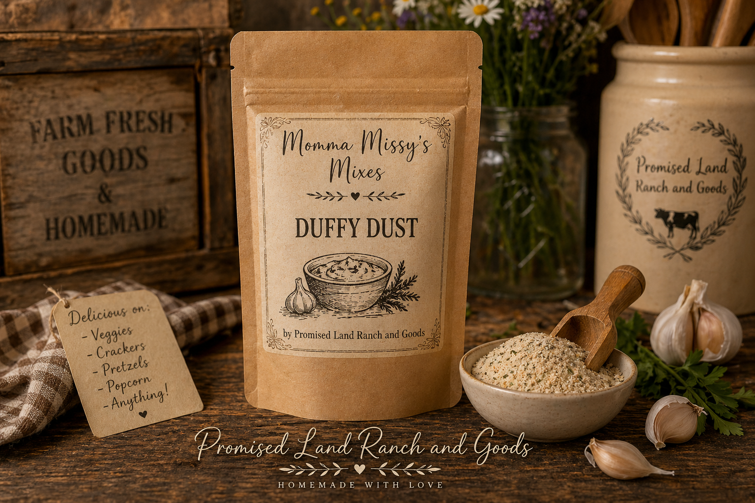 Bring your sourdough baking to life with Duffy Dust, our handcrafted dehydrated sourdough starter from Momma Missy’s Mixes by Promised Land Ranch and Goods.